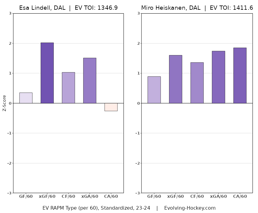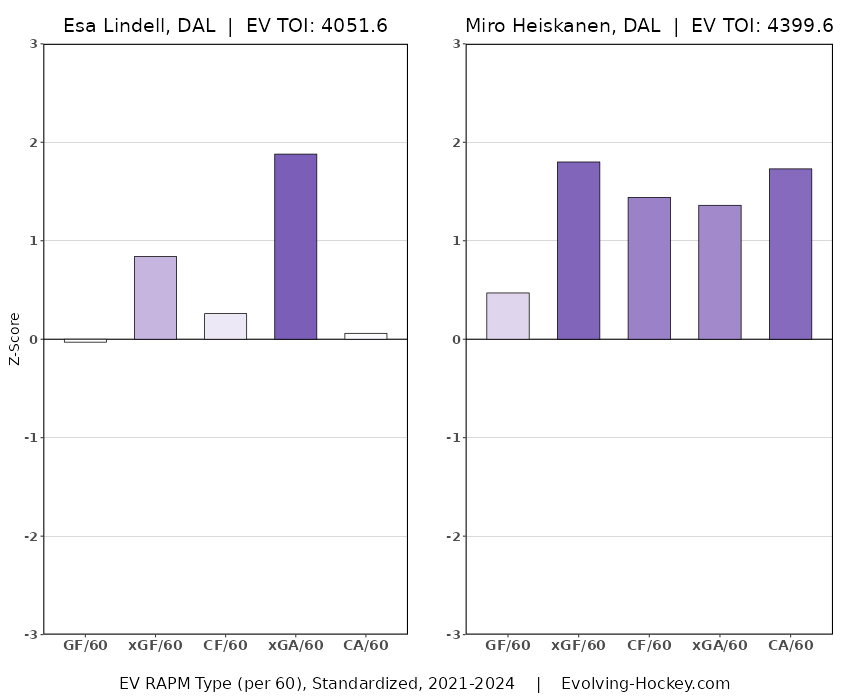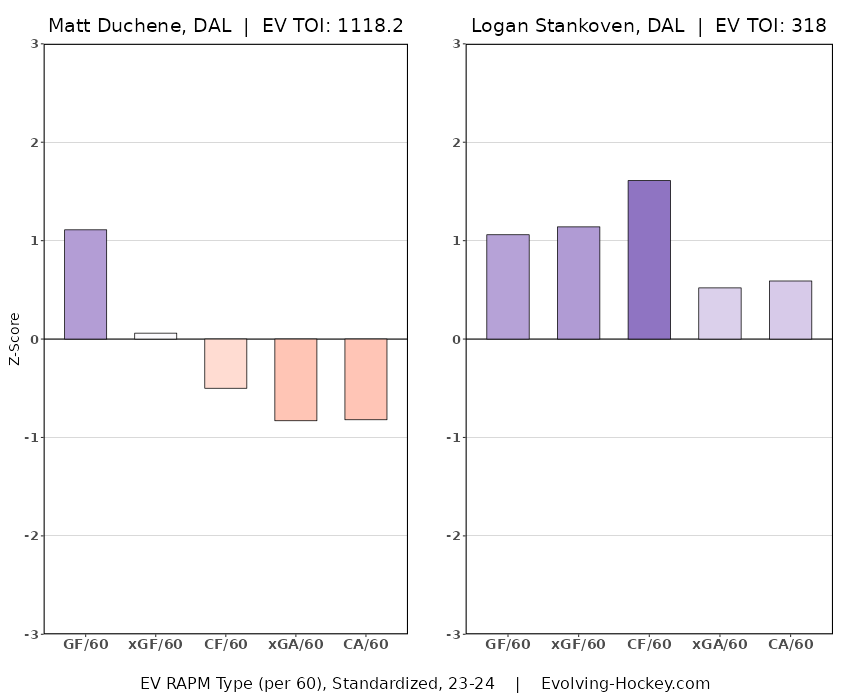 Take away the production totals, and which forward would you prefer? Matt Duchene or Logan Stankoven? If you’re like every other Stars fan, this is obviously easy to answer. However, what if you were only allowed to use your regular season games as your only guide? After all, Stankoven was only on pace for 48 points to Duchene’s 65. As for this question through a RAPM lens, the choice is clear, and it’s the choice of a few generation…