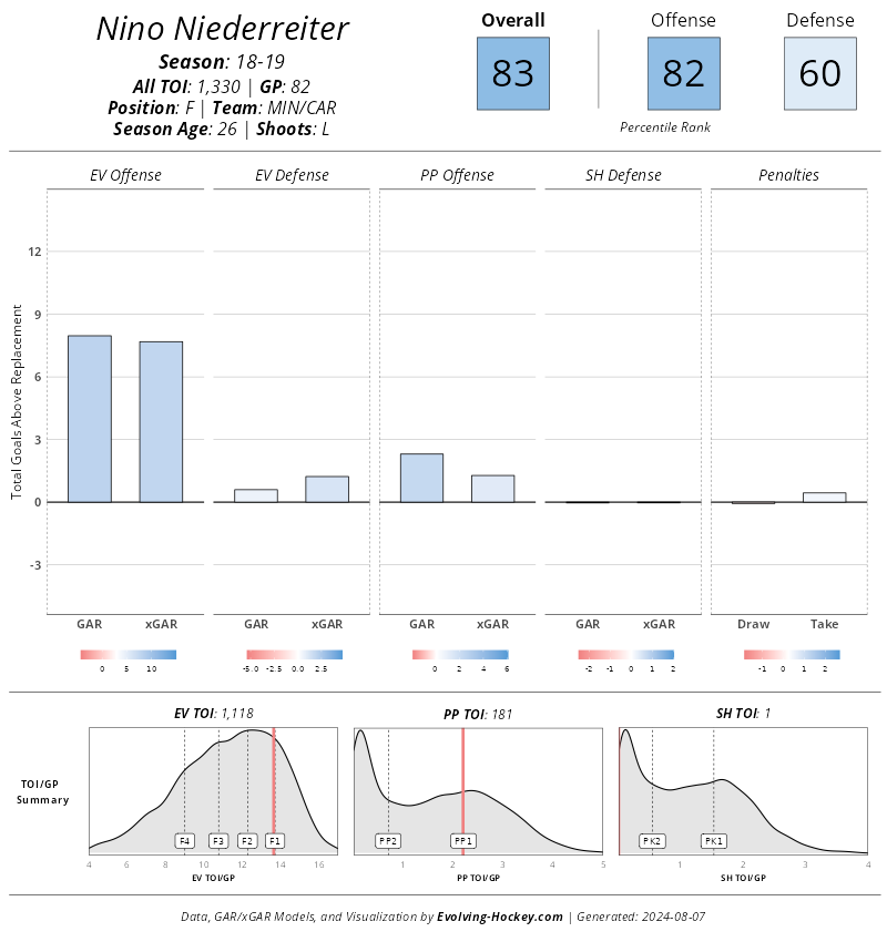 Nino Niederreiter in 2018 is a great example. Long considered an analytics darling, he struggled to produce in his final season with Minnesota, and in the end was traded for another struggling player in Victor Rask. Nino was a hell of an offensive player that year, with strong impacts on shot quality as well as goal-scoring. The hockey gods simply didn’t reward him.
