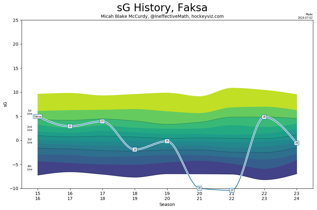 Faksa had what might have been his worst season in a Stars uniform. On a point per game basis, it was his statistical nadir. The end result is a player, once adored in a more limited role (where he exceled), getting healthy scratched and in the end, discarded. But sG found him to be more valuable, likely owing to his - still - strong defensive impacts. So how does he rate higher than a player (in this case, Joe Pavelski) who scored 67 points?