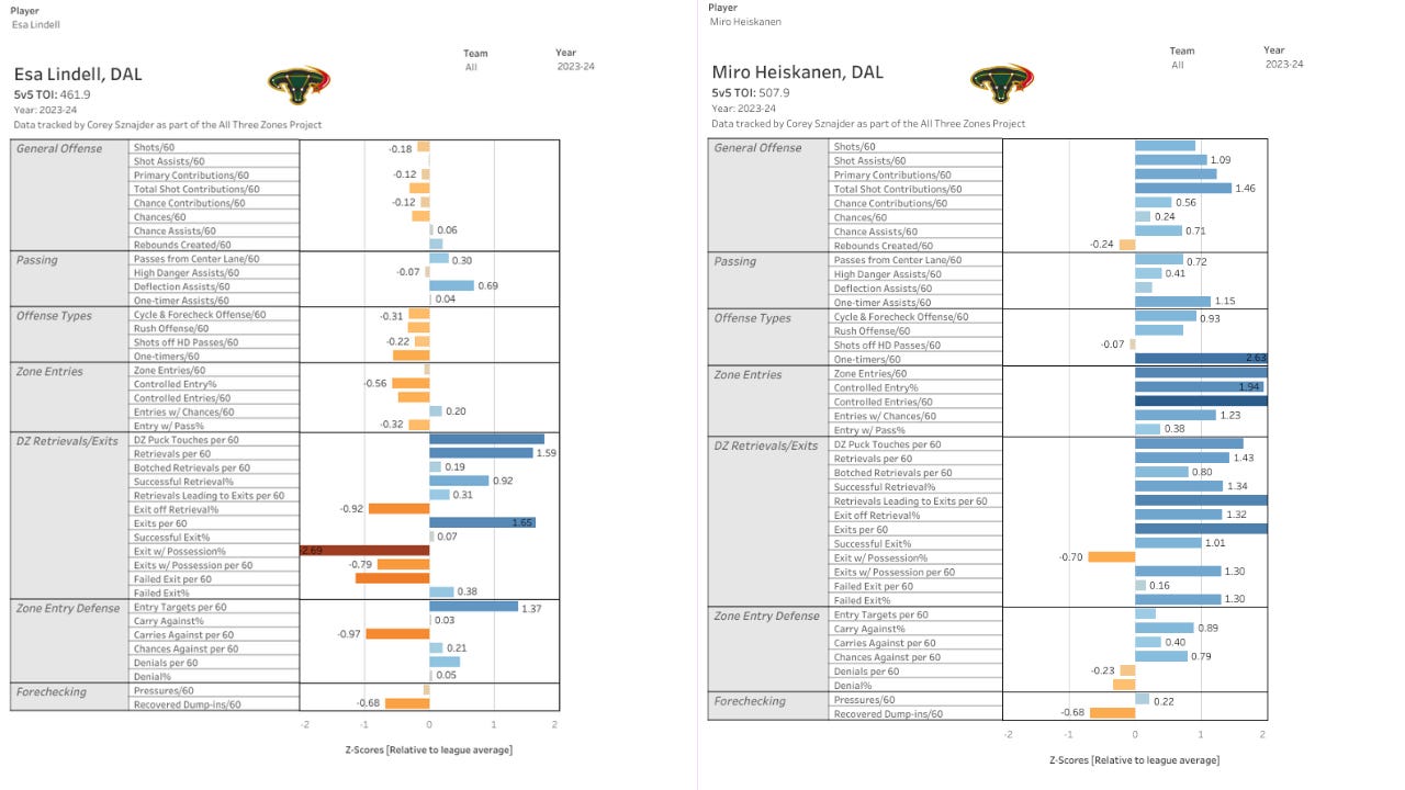 It’s been said that these are not great for assessing performance. I disagree. I would amend that to say that this might be broadly true of forwards (itself a suspicious claim), but it is not true of defensemen. I think Corey’s microstatistics are great for assessing the performance of defensemen precisely because it captures more of their impact across all three zones. Defensemen naturally consist of more player types, and have less duties bound by outcomes. For example, using RAPM, Esa Lindell (.356 in shot quality differential per game) grades out as a higher-performing defender than Miro Heiskanen (.336).