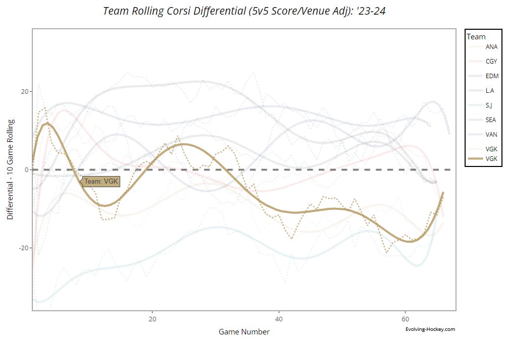 They’re bound for an uptick, but they’re cutting it close. Funnily enough, it’s a very similar story to Vegas the year they missed the playoffs. They were a good team then too, ranking 9th in expected goal differential. That team deserved a better fate, but as the now-commonly referenced Unforgiven quote goes, deserve doesn’t always have something to do with it.
