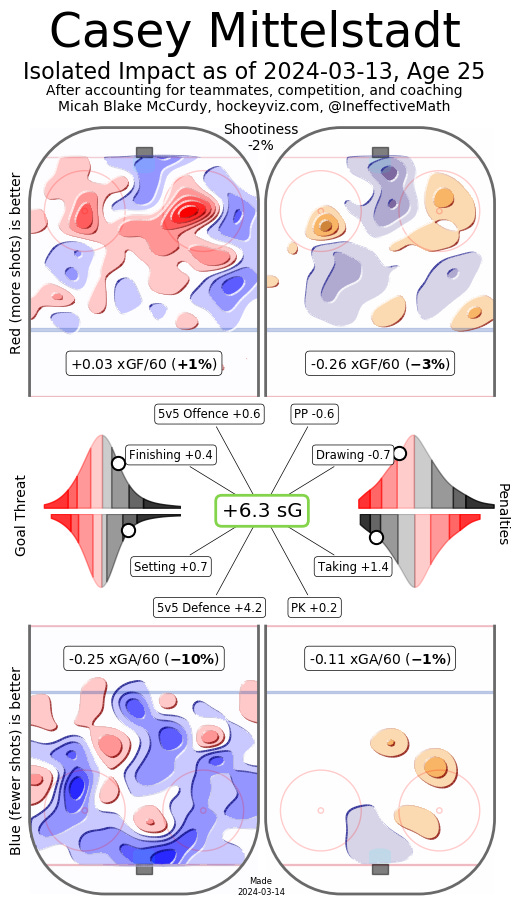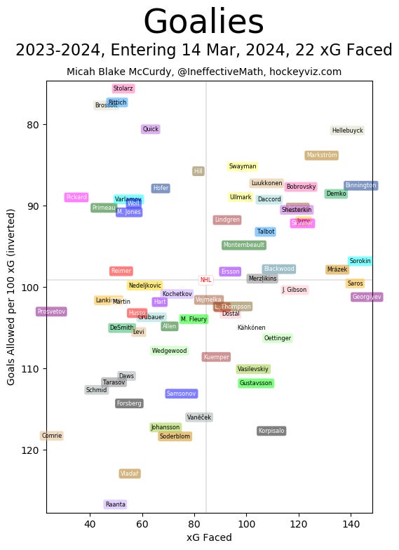 Re: Oettinger, I've been working on a pretty big project aimed at evaluating goalies based on shots that are actually on net, but from what I'm looking at I think he's very consistently just a little bit above average. It's still a work-in-progress, but his 2022-23 season looks a lot less impressive by my metric.