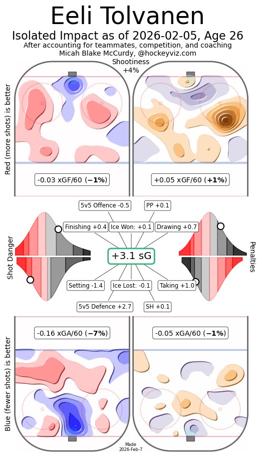 Nothing truly special that stands out. Tolvanen has strong finishing chops — it should be noted that he’s only shooting 11 percent this season, which is actually under his career average — and has some quite strong defensive impacts. He also has some surprisingly good transition ability. He’s a little like Jason Robertson in that his lack of footspeed doesn’t hurt him as much as one would think due to some solid pokecheck and takeaway ability2.