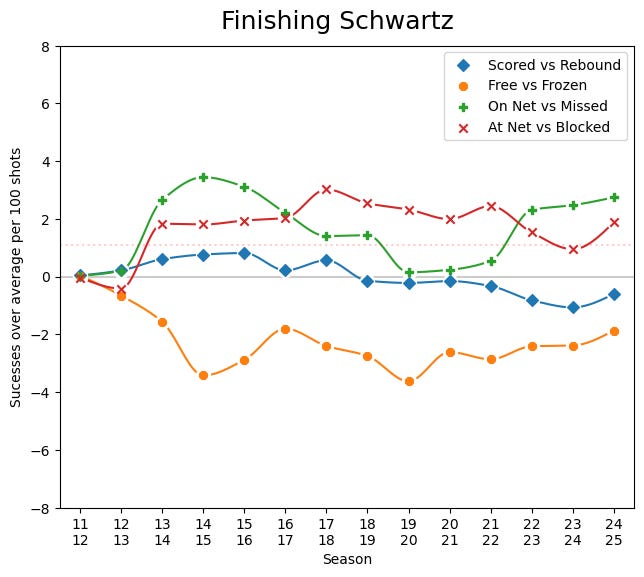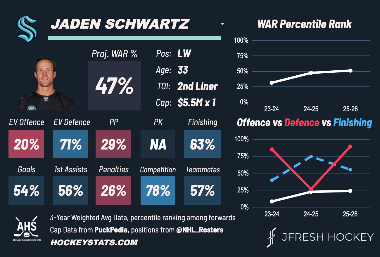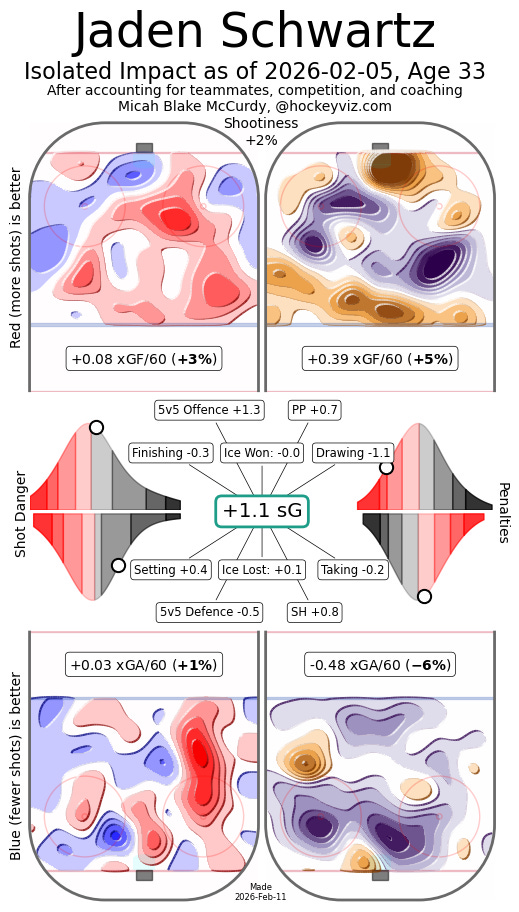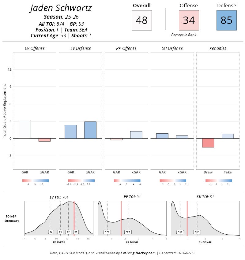 Right now, Schwartz is still showing that he’s a proper two-way forward. Which is important, since that added defensive support is exactly what the duo with Johnston and Rantanen could use (in part because both players have extremely poor defensive impacts this year, as well as last). However, he sort of fits in offensively too as a player who can finish.
