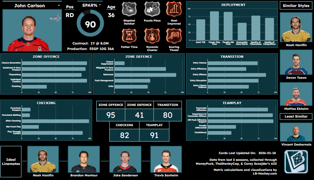 As far as cost goes, I’d imagine something like what the Islanders got from Colorado in the Brock Nelson deal. The Capitals are one of the few teams lately who haven’t been afraid to draft skill, as we’ve seen with Andrew Cristall and Terik Parascak. However, they’ve also done well in the power forward department, which means Dallas has them covered (as they have both). Given that they took a flyer on Sandin, I wouldn’t be surprised if a pick (a 2027 first), a prospect (Cameron Schmidt or Brandon Gorzysnki), and Lundkvist was enough to bring back Carlson1. The Capitals could easily leverage said assets for a turnaround if they wanted, since arguably their biggest flaw this season was a spate of injuries.