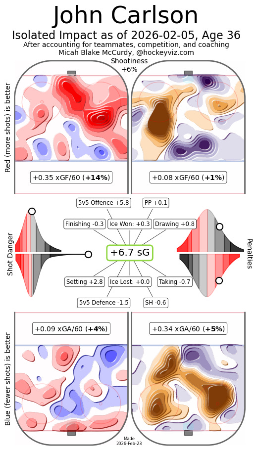 Yes, teams tend to shoot more with Carlson on the ice, but the net gain according to Micah Blake McCurdy’s model amounts to a top pairing defender who does a lot of damage on his side of the ice.