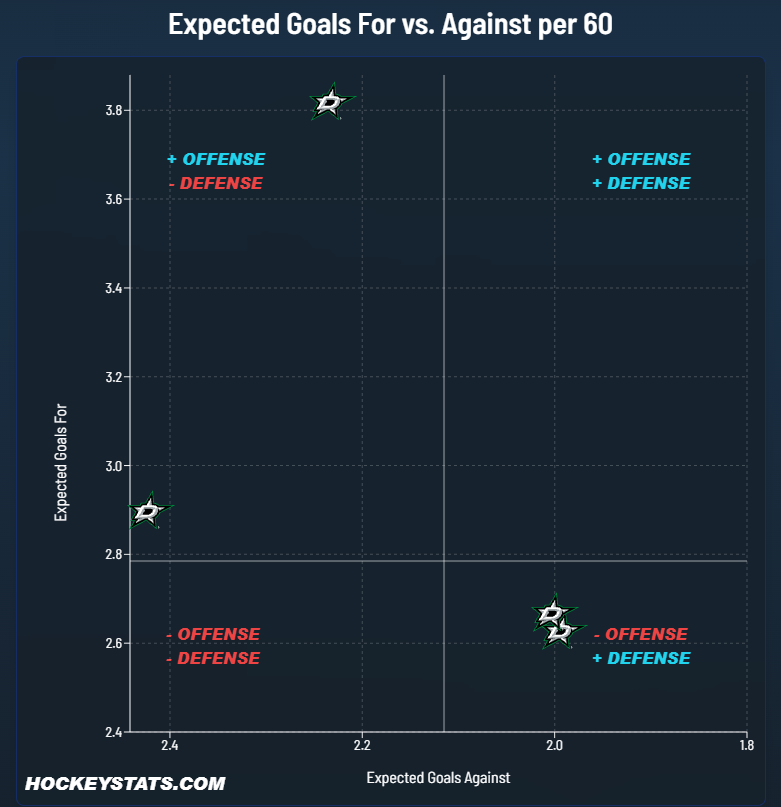 Top left quadrant, at the top: That’s the Jason Robertson line with Roope Hintz and Mavrik Bourque. They’re by far Dallas’ most dangerous line. They’re allowing a little the other way, but not so much that they’re a complete liability.