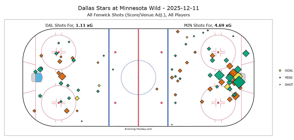 There’s not a ton to dig deep into. This game was simultaneously predictable (it was a well-earned victory from Minnesota, who dominated for stretches), and off-balance. Miro Heiskanen and Zach Bogosian’s goals were on basically nothing plays. That Matt Boldy pass to Marcus Johansson? Certain things just can’t be defended. Kind of like Jason Robertson with a clean look.