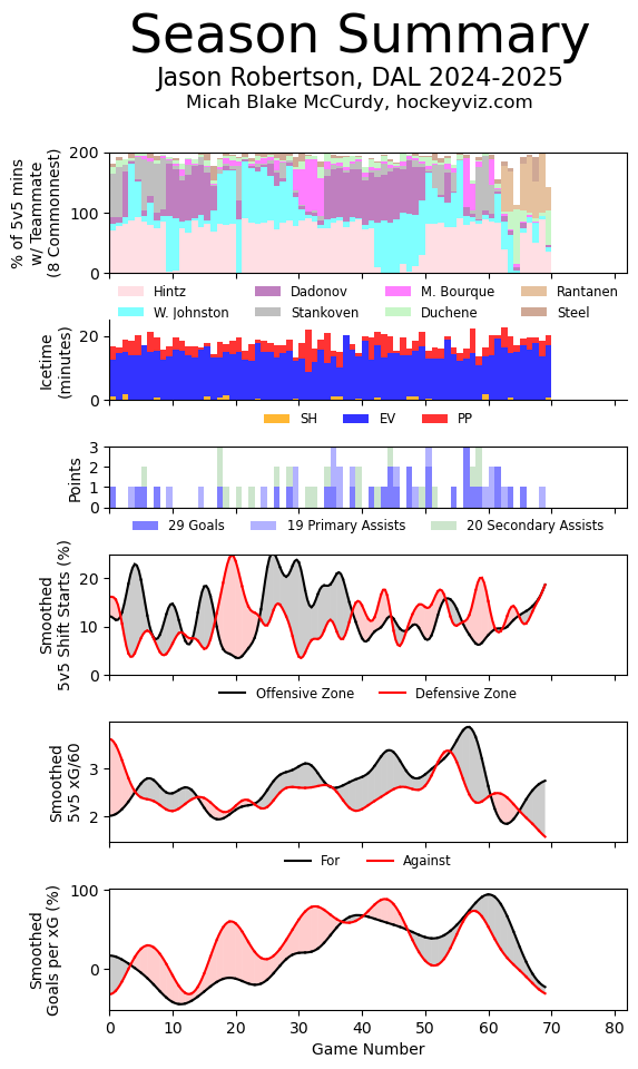 We’ll get to the strays in a bit. For now, it’s good to see the Stars build their own momentum. And I don’t mean winning. Yes, winning is nice. But statistically, there’s no evidence to indicate that teams need to be “hot” going into the playoffs. That makes logical sense since the last regular season games are usually the ones where the starters get a few less minutes, less shifts, and sometimes even games off; not to mention, the backup goaltender gets more games. For me, it’s all about the momentum within the roster. The sustainable patterns that project to always be there. A Jason Robertson hat trick might be an extreme example, but what’s not extreme is the shift-to-shift impact he’s had on offense. Well, technically it is extreme, but you get the point.