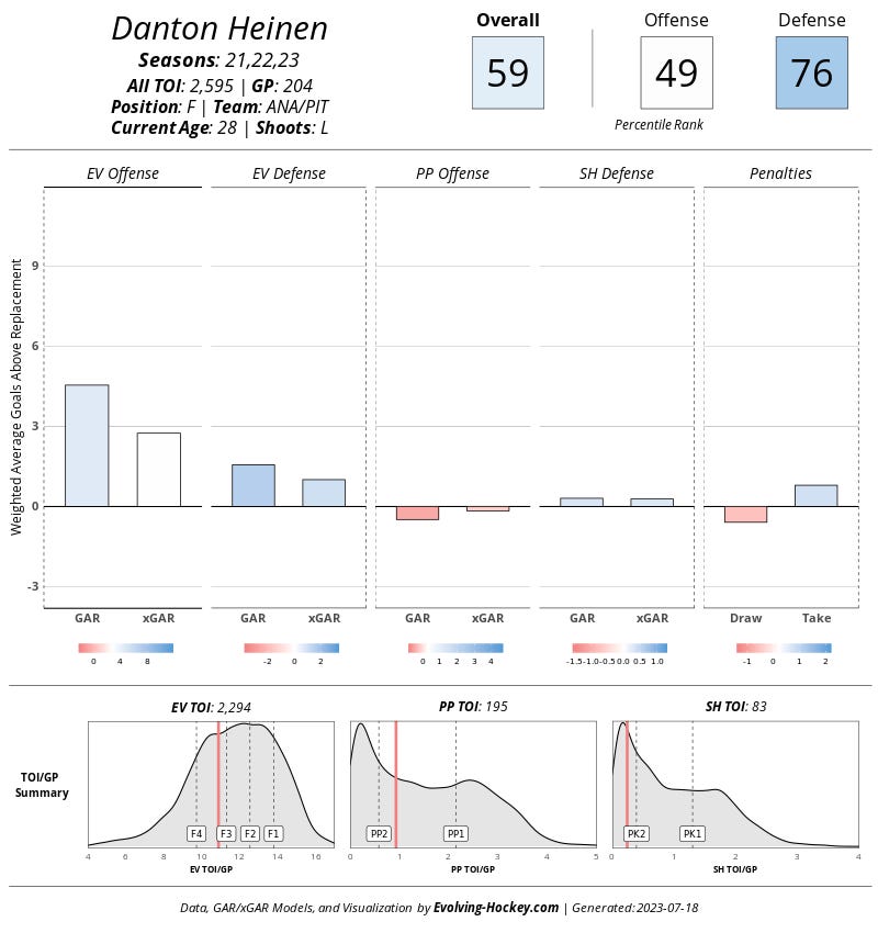 Over the last three years, Heinen represents the best of both bottom six worlds: he has a strong impact on goals, and he’s responsible in his own end. He’s also one of the rare depth wingers who isn’t on a decline.