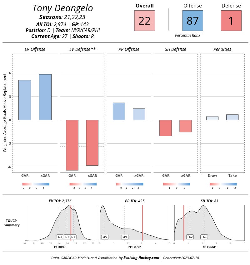 When you consider all the things that make Nils Lundkvist a mystery — strong offensive potential, questionable defense — what would it be worth it to take away that mystery, and guarantee that offense? It’s worth noting that Dallas doesn’t have a strong blueline, but they keeps shots and shot quality down at an above average rate. That tells me that Pete DeBoer is doing a really good job of allowing the system to mask some of its player’s deficiencies. If the system can mask DeAngelo’s deficiencies while maximizing his offense, wouldn’t that be a net positive? Charlie O’Connor (who is an excellent read even if you’re not a Flyers fan) did a deep dive into similar players, and eventually found that DeAngelo’s comparables bounce back defensively. That isn’t to say they get good at defense; just that truly awful defensive years like the one Tony D. had are rare.