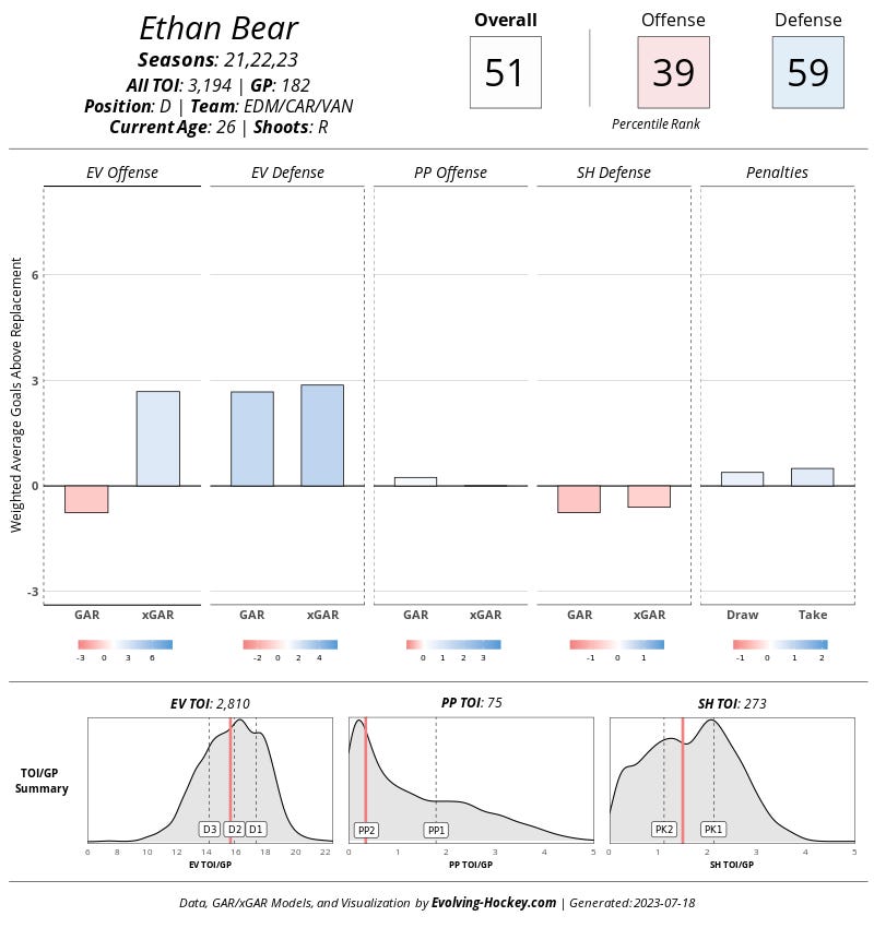 Bear would be nice insurance for Lundkvist if he doesn’t work out. Frankly I don’t see the difference between having Bear as a 7th defender than one of Smith or Steel as a 13th forward; which is why I find the Joel Hanley signing so lowkey obnoxious. If he’s so good as to be defacto trusted in the playoffs, but so negligible as to be a healthy scratched for 90 percent of the regular season then either play him or don’t (!). Beyond that, Dallas needs defensive playdrivers on their backend, and Bear can do that.