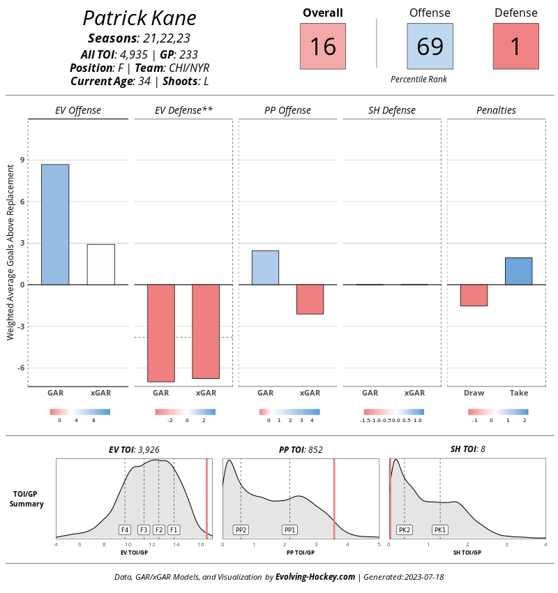 If, like me, sixth grade was when you stopped maturing, then you too were probably whispering “nice” in response to Kane’s offensive percentile. Unfortunately there’s nothing nice about the rest of his game. Yes, he’s productive, but he’s no longer so productive as to offset the rest of his game.