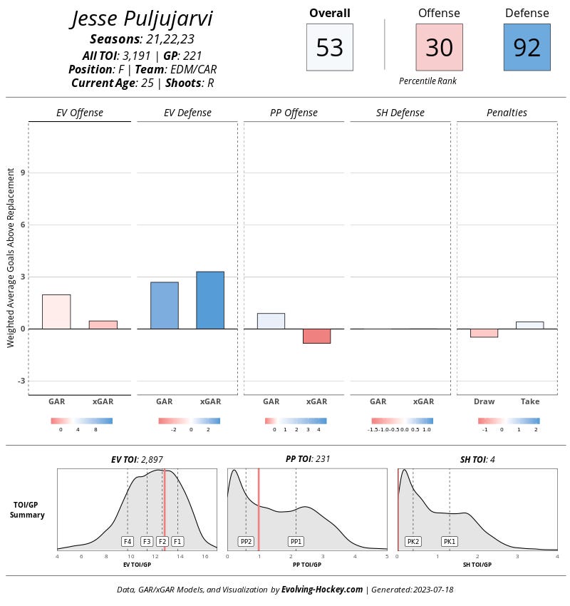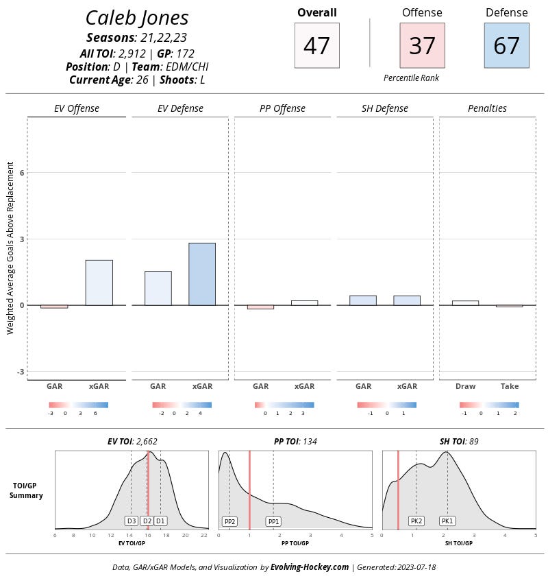 Last but not least, Arlington native, Caleb Jones (brother of Seth Jones). It’s actually kind of crazy how good he grades defensively despite being on two teams over the last three years known for their precise lack of it. As a left shot defender, he doesn’t fit into Dallas’ setup, but you can never have enough depth, right?