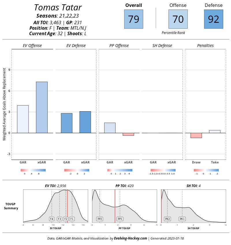 I’m surprised Tatar hasn’t found a home. This is a guy who went for a first rounder, a second rounder, and a third rounder (yes, that’s on Vegas for doing something so dumb). Despite being on the older side, he’s been incredibly consistent throughout his career. He was never a big point producer, but he still managed to score 48 points last year in New Jersey. Most importantly though, he’s a strong playdriver. Over the last three years, he’s had an incredible impact on shot quality while playing very responsible hockey going the other way. He’s exactly the kind of player I’ve been screaming Seguin and Marchment need. Granted, Nill went out and got Duchene instead, so there’s nothing to truly harp on here. I just maintain that Marchment and Seguin need to be abandoned. Failing that, they need someone else to hold it together before the bottom falls out. (If Marchment’s down year was a prophecy of things to come AND Seguin keeps declining, then woof.)